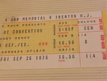 Unlike many of the previous year’s concerts, the September 26, 1975 Trenton War Memorial show opened with “Dirty Linen” and “Tam Lin.” After a performance at Philadelphia’s Academy of Music five days earlier, Fairport put in an appearance on Gene Shay’s folk music program on WMMR, during which the band was interviewed and Swarbrick and Pegg entertained by playing a series of instrumental traditional pieces.(5) When asked why “Tam Lin” had been added to the set, Denny replied, “I just got fed up with singing ‘Matty Groves,’” and explained further that audiences usually requested both songs. As if to prove her right, several callers to the radio station that night solicited on-air performances of both tunes.
