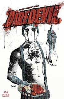 Soule’s portrait of Daredevil as vigilante may be dark, but that can be partially attributed to the new villains he faces. Tenfingers is brutal as well as legally savvy, with a charismatic touch to lure and control his legion of followers, but it’s Muse, introduced in the “Dark Art” arc of issues #10-14, who’s the more frightening because there is so little known about him other than his appearance and his crimes. Of the former, John Schell notes that “his backpack and hat make him look like a hipster guerrilla artist, while the white costume and mask are like a blank canvas. However, the image of what looks like blood flooding down from his red eyes and pooling onto his chest, that is truly memorable and unsettling.”